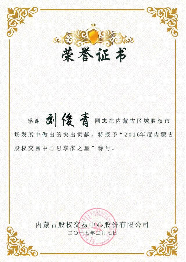 在37日上午召開的首屆內(nèi)蒙古股權(quán)交易中心會(huì)員和分支機(jī)構(gòu)大會(huì)上,內(nèi)蒙古農(nóng)牧業(yè)產(chǎn)業(yè)化龍頭企業(yè)協(xié)會(huì)因積極支持并參與內(nèi)蒙古區(qū)域股權(quán)市場工作,榮獲內(nèi)蒙古股權(quán)交易中心頒發(fā)的“突出貢獻(xiàn)獎(jiǎng)”,協(xié)會(huì)執(zhí)行會(huì)長兼秘書長林永亮及常務(wù)秘書長劉俊青均榮獲“內(nèi)蒙古股權(quán)交易中心思享家之星”稱號(hào)。這是對協(xié)會(huì)在2016年對內(nèi)蒙古區(qū)域股權(quán)市場發(fā)展中突出貢獻(xiàn)的肯定,更是承載著一份責(zé)任和希望,新的一年,內(nèi)蒙古農(nóng)牧業(yè)產(chǎn)業(yè)化龍頭企業(yè)協(xié)會(huì)將繼續(xù)秉承“溝通 服務(wù) 自律 發(fā)展”的服務(wù)宗旨,乘勢而上,加壓奮進(jìn),開拓創(chuàng)新,找準(zhǔn)協(xié)會(huì)工作與股權(quán)經(jīng)濟(jì)建設(shè)的結(jié)合點(diǎn),為推動(dòng)農(nóng)牧業(yè)產(chǎn)業(yè)化發(fā)展做出新的貢獻(xiàn)。