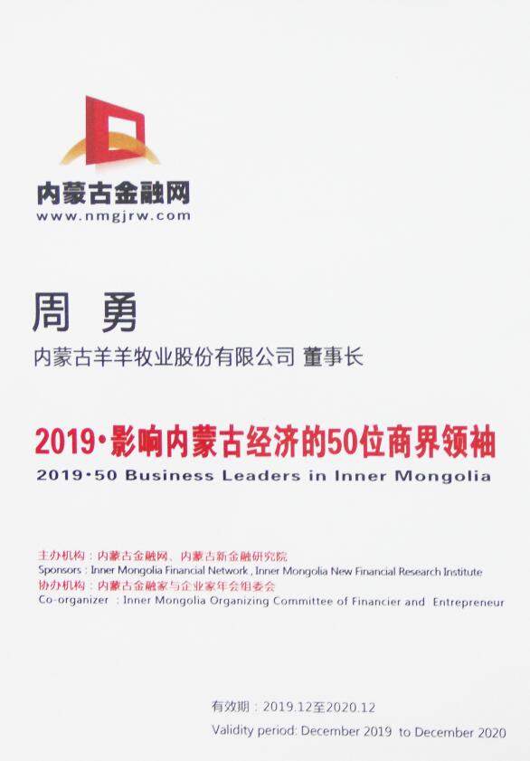 年會期間重磅推出“2019·影響內(nèi)蒙古經(jīng)濟的50位商界領袖名單”,協(xié)會會長、錫林郭勒盟羊羊牧業(yè)股份有限公司董事長周勇,協(xié)會副會長:內(nèi)蒙古伊利實業(yè)集團股份有限公司董事長潘剛、內(nèi)蒙古蒙牛乳業(yè)(集團)股份有限公司總裁盧敏放、內(nèi)蒙古宇航人高技術產(chǎn)業(yè)有限責任公司總經(jīng)理王尚義、維信(內(nèi)蒙古)羊絨集團有限公司董事長郝旭寬、赤峰東榮羊絨發(fā)展(集團)有限公司董事長程旭東、內(nèi)蒙古民豐種業(yè)有限公司董事長盧文兵、內(nèi)蒙古二龍屯有機農(nóng)業(yè)有限責任公司董事長薛金利、呼倫貝爾肉業(yè)(集團)股份有限公司董事長邵堃等多家單位榮獲此項殊榮。選擇上榜的金融家與企業(yè)家精英在一定程度上反映了2019年其取得的新成績,以及能夠影響企業(yè)管理、行業(yè)格局和更廣闊商業(yè)世界的杰出領導者。