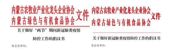 一、內(nèi)蒙古農(nóng)牧業(yè)產(chǎn)業(yè)化龍頭企業(yè)協(xié)會聯(lián)合內(nèi)蒙古綠色與有機食品協(xié)會,先后發(fā)布了《關(guān)于做好“兩節(jié)”期間新冠肺炎疫情防控工作的倡議書》和《關(guān)于做好新冠肺炎疫情防控工作的倡議書》,引導(dǎo)各會員單位堅決遏止借機囤積居奇、哄抬物價、虛假宣傳等破壞市場秩序、損害消費者合法權(quán)益的不法行為,堅決遏制疫情擴展蔓延,積極投身新型冠狀病毒防控戰(zhàn)役中。