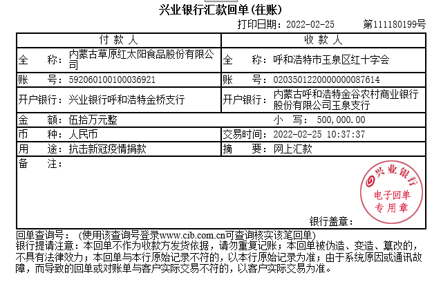 18、會員單位-內(nèi)蒙古草原紅太陽食品股份有限公司:2022年2月25日,紅太陽公司向呼和浩特市紅十字會捐款50萬元,用于抗擊新冠疫情。