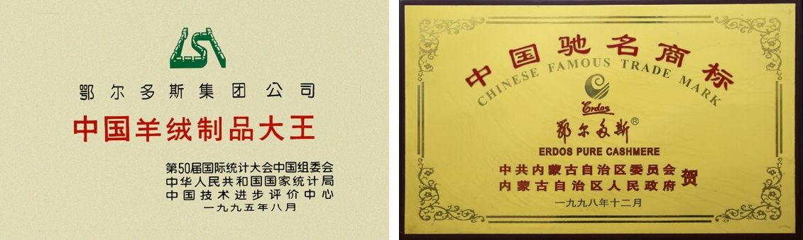 △左:1995年鄂爾多斯集團榮獲“中國羊絨制品大王”稱號;右:1998年,鄂爾多斯品牌榮獲“中國馳名商標”榮譽。