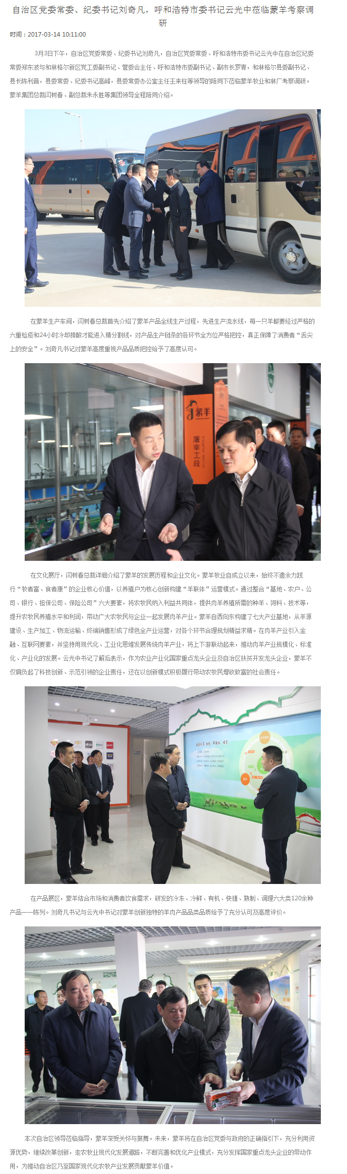 自治區(qū)黨委常委、紀委書記劉奇凡,呼和浩特市委書記云光中蒞臨蒙羊考察調研