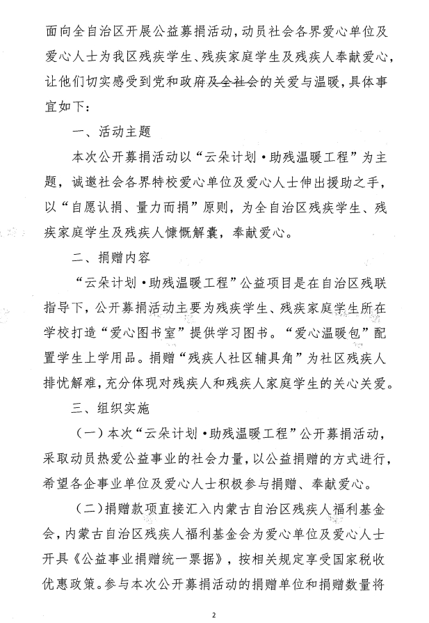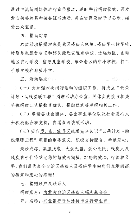 關(guān)于開展“云朵計劃·助殘溫暖工程’公益項(xiàng)目專項(xiàng)募捐的通知