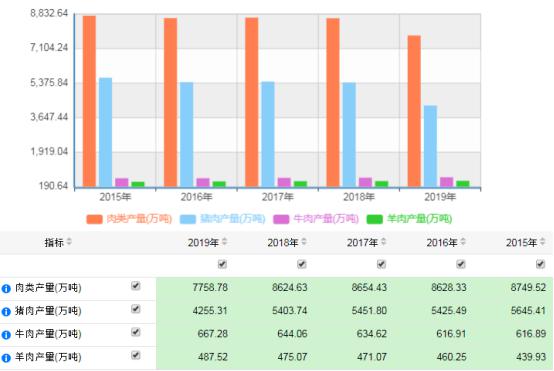 全國2015-2019年牛、羊、豬產(chǎn)量情況