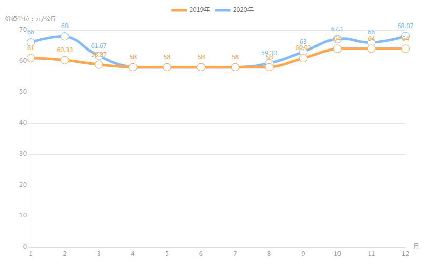對內(nèi)蒙古幾大農(nóng)貿(mào)批發(fā)市場羊肉價(jià)進(jìn)行匯總分析得出:呼和浩特市內(nèi)蒙古美通農(nóng)產(chǎn)品批發(fā)市場羊肉最高價(jià)格出現(xiàn)在2020年11月68元/公斤,最低價(jià)格出現(xiàn)在2019年4月52元/公斤。呼和浩特市東瓦窯批發(fā)市場羊肉最高價(jià)格出現(xiàn)在2020年12月73.38元/公斤,最低價(jià)格出現(xiàn)在2019年5月61.08元/公斤。包頭市友誼蔬菜批發(fā)市場羊肉最高價(jià)格出現(xiàn)在2020年12月67.16元/公斤,最低價(jià)格出現(xiàn)在2019年3月54元/公斤。內(nèi)蒙古赤峰西城市場羊肉最高價(jià)格出現(xiàn)在2019年9月75.52元/公斤,最低價(jià)格出現(xiàn)在2019年3月56.97元/公斤。羊肉價(jià)格和去年同期相比整體上漲,漲幅基本在每公斤5-15元左右。