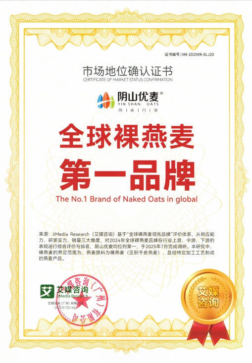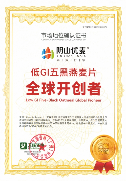 2025年7月,內(nèi)蒙古陰山優(yōu)麥?zhǔn)称酚邢薰精@得權(quán)威咨詢機(jī)構(gòu)艾媒咨詢(iiMedia Research)頒發(fā)的“全球裸燕麥第一品牌”與“中國(guó)國(guó)產(chǎn)燕麥第一品牌”市場(chǎng)地位確認(rèn)證書。同時(shí),其創(chuàng)新產(chǎn)品“低GI五黑燕麥片”亦被權(quán)威認(rèn)證為全球開(kāi)創(chuàng)者,標(biāo)志著陰山優(yōu)麥在全球燕麥行業(yè)取得突破性成果。